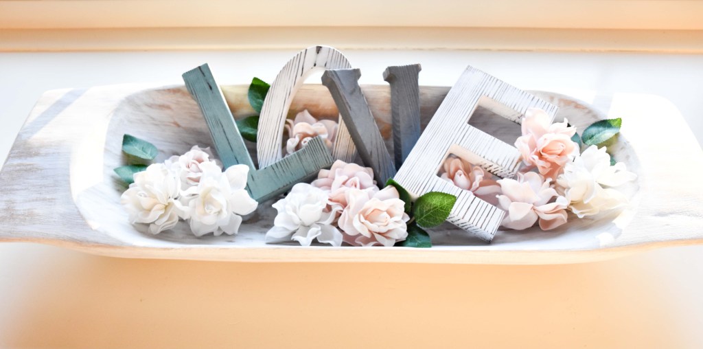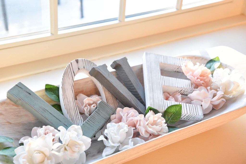 Hello everyone! Today, I wanted to share more of my Valentine’s Day decor with you. I put together Valentine arrangements here and there around my home that express love and what better way to express it? Well, with the actual word.